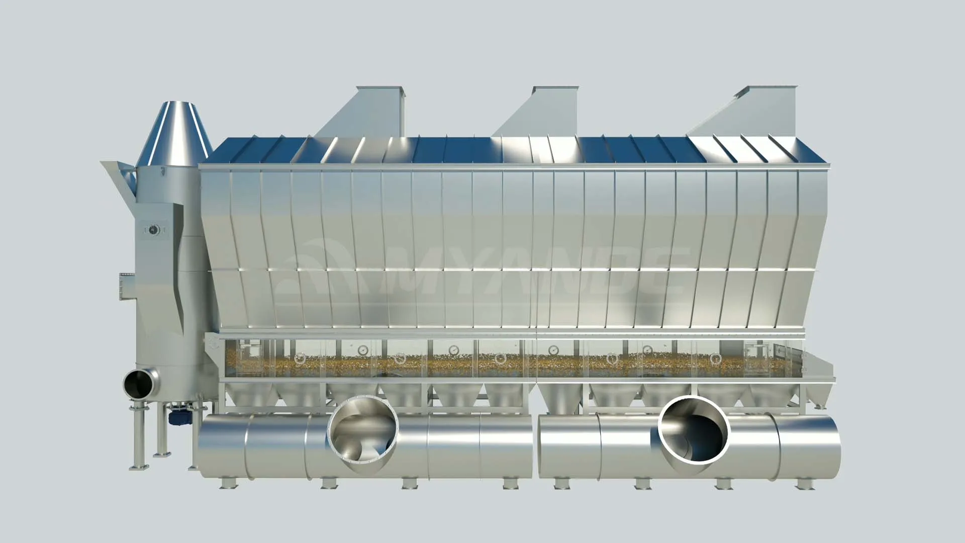 Myande’s Fluid Bed comprising a pre-drying tower and horizontal fluid bed. It’s specifically designed for handling high-moisture, high-viscosity fermentation materials. The system features a unidirectional material flow, eliminating the need for material recirculation and ensuring uniform and consistent drying while effectively preserving product activity.